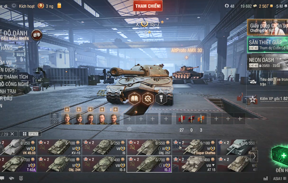 Acc sở hữu 18 tank từ cấp 6 đến cấp 10 đã có sẵn trong gara, đủ mọi lối chơi cho anh em trải nghiệm. Nổi bật nhất là 3 tank cấp X cực mạnh gồm 60TP Lewandowskiego – trâu bò, dame to bắn cực đã; IS-7 – giáp dày, lao thẳng combat cực kỳ sướng; và T-62A – cơ động, xoay chuyển linh hoạt, gánh team cực ổn!