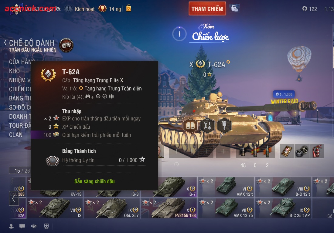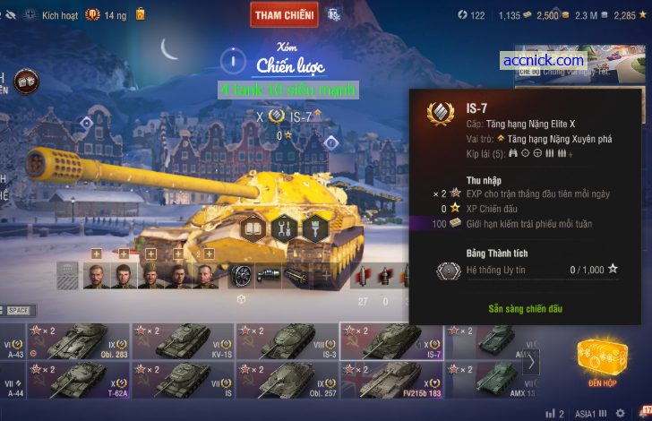 Bán acc World of Tanks với 26 xe trong gara, sở hữu 4 xe cấp 10 mạnh như IS-7, FV 183, BC 25T, T62a…phù hợp chơi lâu dài, leo rank và giải trí, nhận thanh toán thẻ cào hoặc chuyển khoản