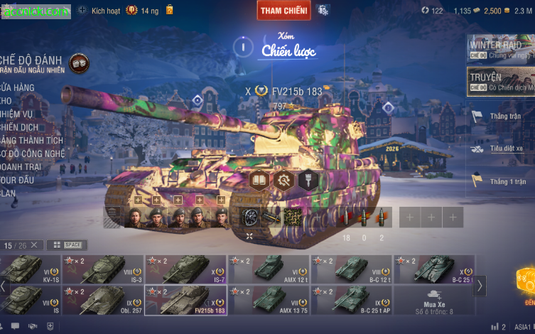 Acc sở hữu 4 xe cấp 10 cực chất, nổi bật với IS-7 – “trùm” tăng nặng Liên Xô giáp dày như tường thành, lao lên là áp đảo đối thủ. FV215b 183 với khẩu “derp” huyền thoại có thể khiến team địch bay màu chỉ sau một phát bắn. Bên cạnh đó là BC 25T – sát thủ cơ động Pháp, úp sọt nhanh gọn rồi rút lui như ninja, và T62A – tank trung cân bằng, dễ chơi, hiệu quả cao. Tất cả tạo nên một acc vừa mạnh vừa cực kỳ “đã tay”.