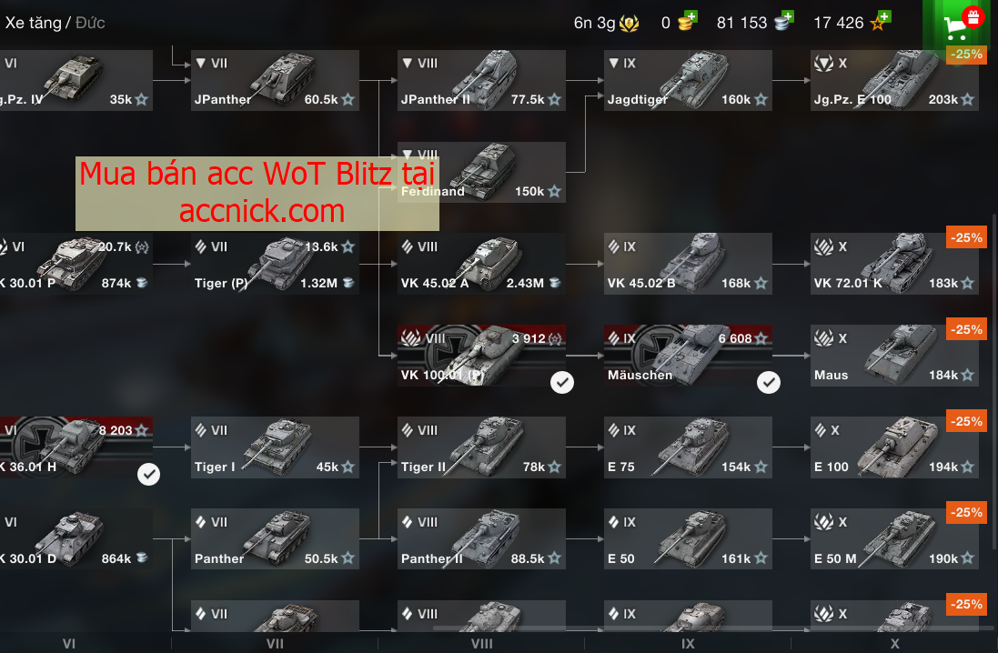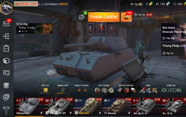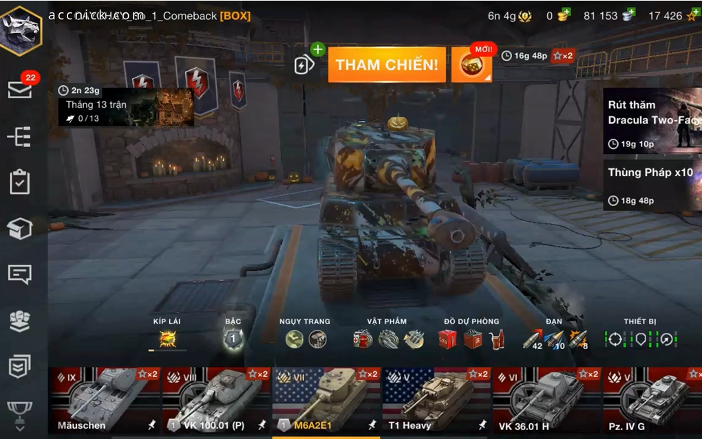 Shop bán tài khoản World of Tanks Blitz với dàn xe tăng cực mạnh, bao gồm những chiếc Mäuschen (Tier IX), VK 100.01 (P), và M6A2E1 sẵn sàng tham chiến. acc mất mail giá siêu rẻ tank hạng nặng dễ chơi, shop có nhận thanh toán bằng thẻ cào hoặc chuyển khoản.