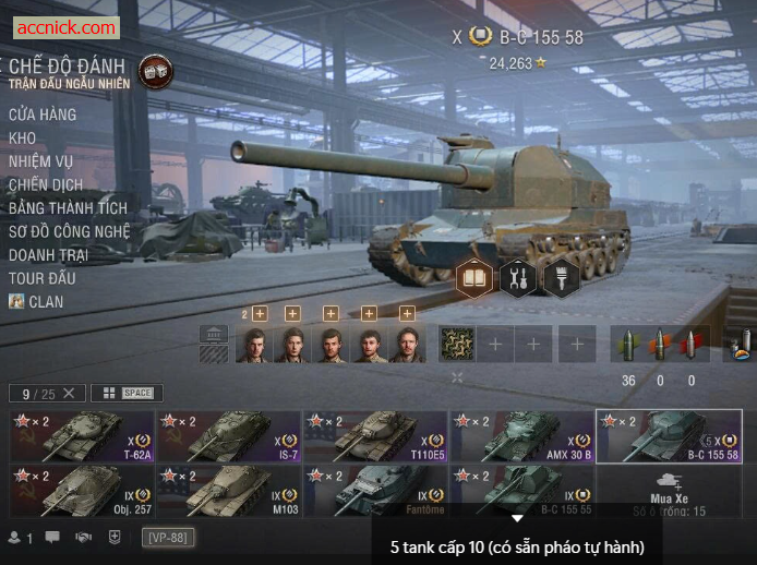 VN_nup - Bán acc World of Tanks PC có 5 tank cấp 10: AMX 30 B, T-62A, IS-7, Pháo BC, T110E5 cùng tank premium cấp 9 Fantome farm bạc ổn định. Acc WoT phù hợp leo rank, clan war và chơi endgame, mua là chiến ngay. Shop Anh Sỹ uy tín hơn 5 năm.