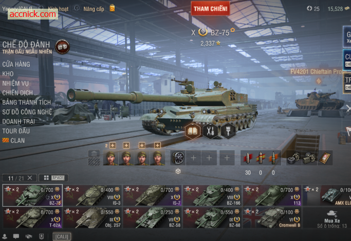 Acc sở hữu 4 xe Tier X cực mạnh: BZ-75 “trâu bò gắn pháo” lao lên tạo áp lực cực lớn; IS-7 giáp nghiêng bá đạo, đỡ đạn cực tốt; 113 linh hoạt, đánh áp sát khó chịu; T-62A huyền thoại medium bắn nhanh, chính xác và ổn định. Bộ tứ này bao trùm mọi lối chơi từ tank đỡ đạn, công phá tuyến đầu đến kiểm soát bản đồ, giúp bạn tự tin trong mọi trận đấu.