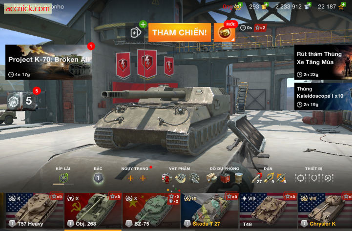 Bán acc WOT Blitz có 3 xe cấp 10 là T57 Heavy, Obj.263, BZ-75 kèm nhiều xe premium xịn như Škoda T 27 Chrysler K T28 Defender, phù hợp leo rank giải trí sưu tầm, shop bán acc World of Tank Blitz uy tín.