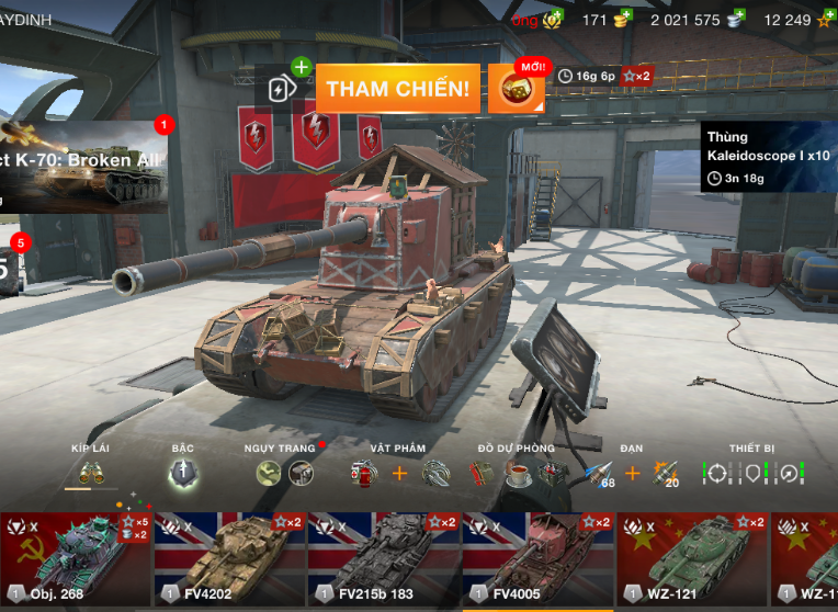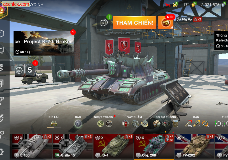 Bán acc WoT Blitz VIP với 13 xe cấp 10 E 100, Grille 15, IS-4, Obj. 268, FV4202, FV215b 183, FV4005, WZ-121, WZ-113, BZ-75, B-C 25 t, AMX 50 B, Foch 155, xe premium hiếm, phù hợp chơi lâu dài, leo rank khỏe, farm bạc nhanh, shop bán acc WoT Blitz uy tín.