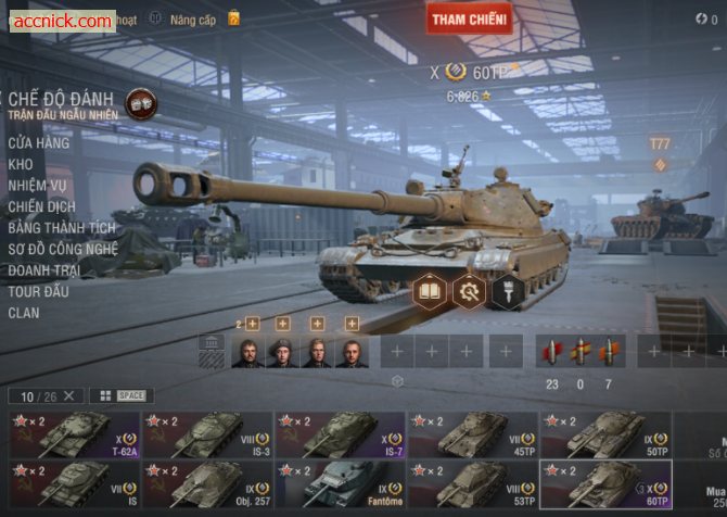 Dàn xe nổi bật trong gara gồm IS-7 trâu bò đúng chất heavy Liên Xô, thủ – đẩy cánh cực khỏe; T-62A medium cơ động, bắn chính xác, giữ nhịp trận đấu; và 60TP Lewandowskiego heavy Ba Lan dame lớn, trao đổi đạn cực lợi. Ngoài ra còn có IS-3, Object 257, 50TP Tyszkiewicza, 45TP Habicha đã cày sẵn, phát triển tiếp rất nhanh, cùng Char Mle. 75 Fantôme – premium IX độc lạ, vừa chơi kỹ năng vừa farm thêm tài nguyên.