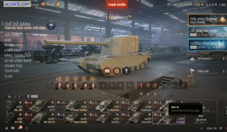Điểm nhấn là dàn tank chất lượng cao, nổi bật với FV4005 Tier X – khẩu pháo “xóa sổ” đúng nghĩa, bắn phát nào thốn phát đó. Bên cạnh đó là Object 283 hiếm, mang lại trải nghiệm medium linh hoạt, dễ tạo highlight. Ngoài ra còn có nhiều xe premium cực ngon như SU-122-44 dame to, cơ động; Super Hellcat ngụy trang tốt, tốc độ cao; cùng dàn pháo thủ như Charioteer, Achilles, Conway chuyên bắn tỉa từ xa cực khó chịu.
