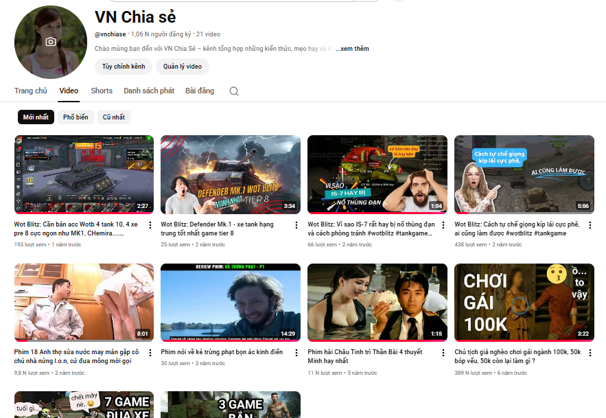 Bán kênh YouTube “VN Chia sẻ” – 1.06K subs, kênh sạch lập từ 2017, nội dung game + chia sẻ đa dạng, có 1 video hot hơn 389.000 lượt xem. Kênh hoạt động ổn định, không vi phạm bản quyền, không cảnh cáo, view tự nhiên và dễ chuyển hướng sang mọi lĩnh vực.