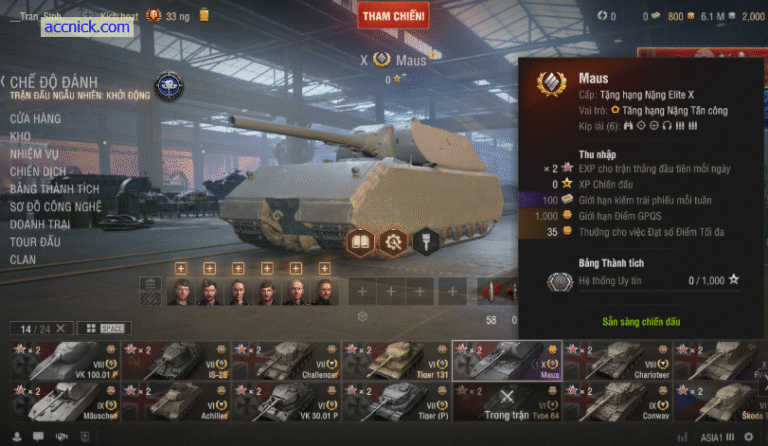 Ngoài ra còn có dàn xe premium hữu dụng như IS-2S, Tiger 131 huyền thoại, Skoda T-24… hỗ trợ farm bạc, train kíp lái và chơi giải trí cực tốt. Acc đã xác thực, giao dịch uy tín tại accnick.com, hỗ trợ nhanh chóng. Đây là lựa chọn lý tưởng cho anh em đam mê World of Tanks muốn sở hữu acc ngon, chơi sướng mà không tốn thời gian cày cuốc.